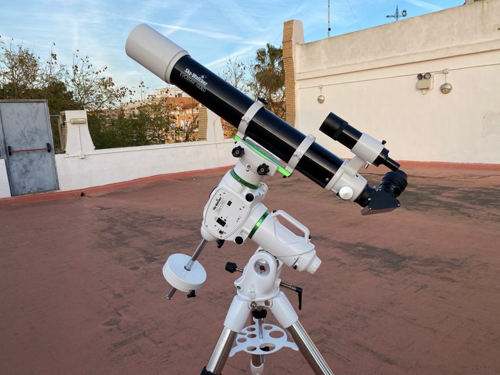 Telescopio refractor apocromático Skywatcher modelo Evostar 100ED, con una relación focal de F9, es un tubo un poco oscuro, pero al ser apocromático rinde muy bien tanto en observación visual como en astrofotografía, proporcionando imagenes de estrellas puntuales. Se trata de un telescopio muy polivalente, pudiendose utilizar tanto para cielo profundo como para planetaria. Es el primer telescopio portátil que adquirió la asociación.